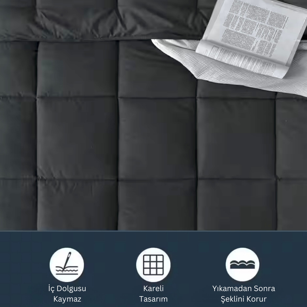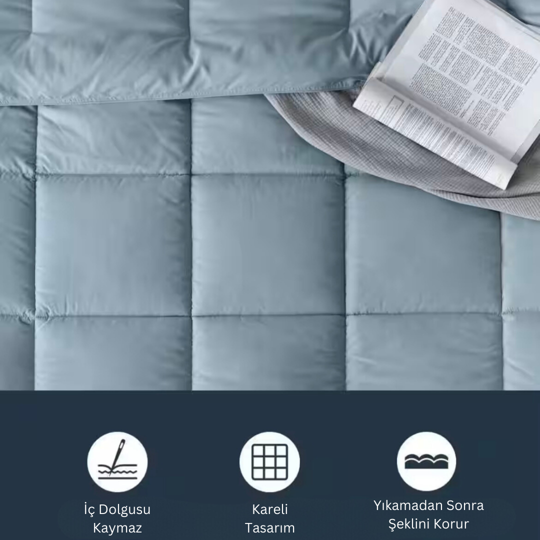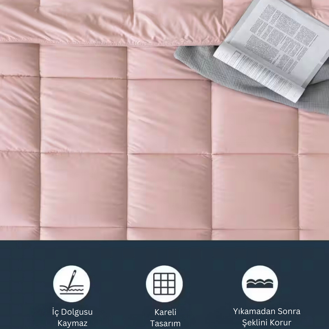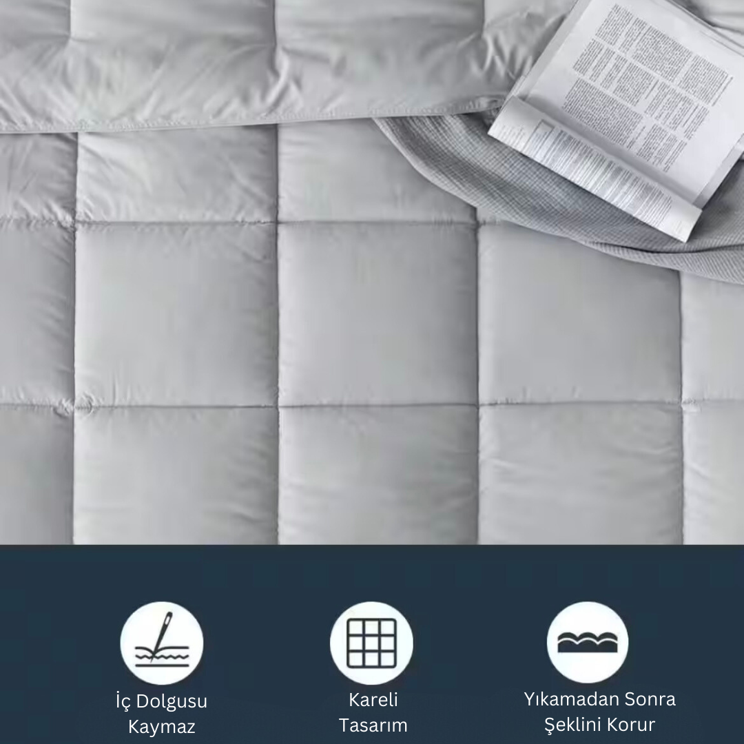 Pamuk dış yüzeyi sayesinde cilt dostudur, nefes alır ve gece boyunca terleme yapmaz. İç dolgusundaki silikon elyaf ise hafif ama hacimli yapısıyla yorganın formunu korur ve homojen ısı dağılımı sağlar.